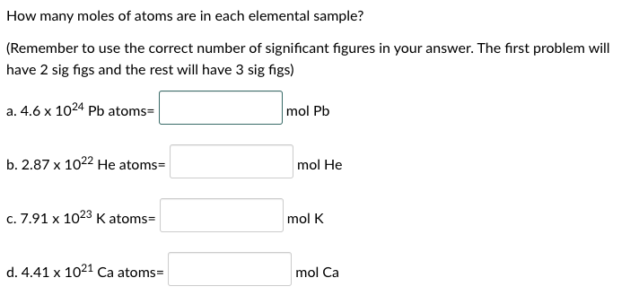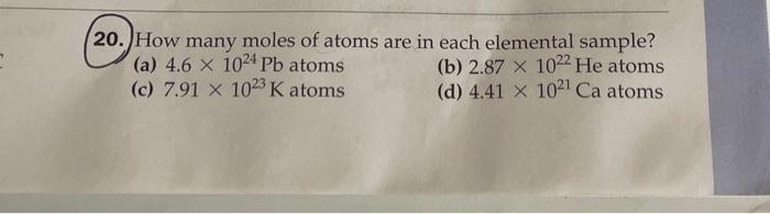 Solved How Many Moles Of Atoms Are In Each Elemental Sample A 4 6 Times 10 24 Mathrm Pb Atoms B 2 87 Times 10 22 He Atoms C 7 91 Times 10 23 Mathrm K Atoms D 4 41 Times 10 21 Mathrm Ca Atoms