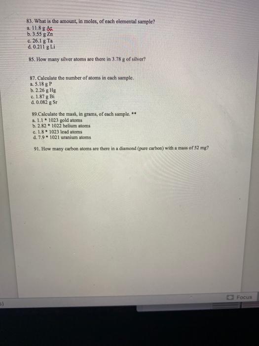 Solved How Many Moles Of Atoms Are In Each Elemental Sample A 1 34 Mathrm G Mathrm Zn B 24 9 Mathrm G Mathrm Ar C 72 5 Mathrm G Mathrm Ta D 0 0223 Mathrm G Mathrm Li